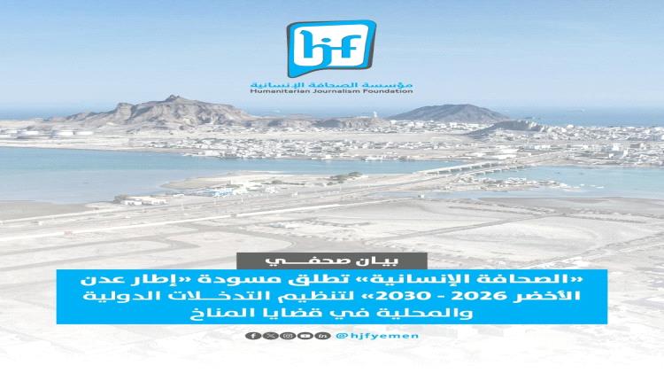 أطلقت مؤسسة الصحافة الإنسانية (hjf)، اليوم، مسودة الإطار الموضوعي لتدخلات المنظمات الدولية والمحلية: نحو تعزيز مرونة مدينة عدن بيئياً ومناخياً (2026-2